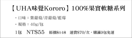 商品訊息簡述: 只要55元即可享有【UHA味覺Kororo】原價118元100%果實軟糖系列1包(40g/包),口味:紫葡萄/青葡萄/藍莓,購滿9包免運。